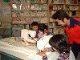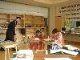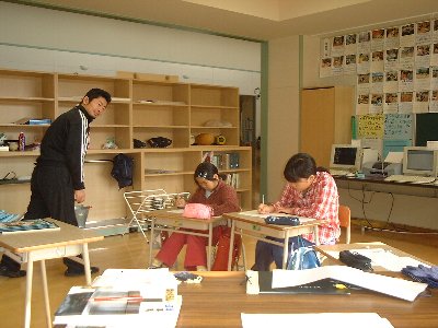 トートバック作り。トモヤ君は下糸をまき,ミサキさんは下糸をつけている。 |