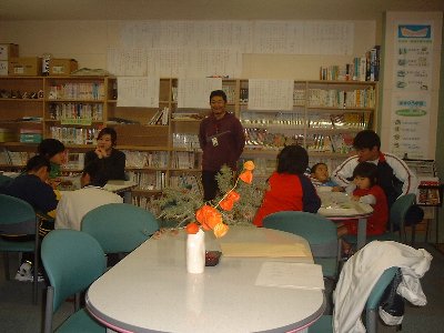 図書コーナーで英語教室をしました。最初は自己紹介。 |