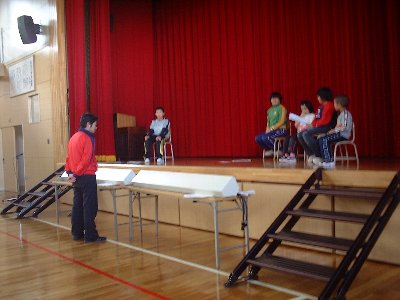 自由研究発表会。自分の工作をしっかり,大きな声で発表できた。 |