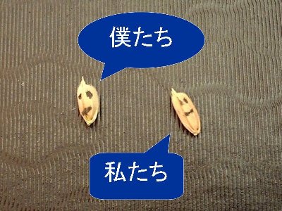 土から土ごと持ち上げられました。まわりを見てみると銀色の船に乗せられるところでした。しばらくたつと,船は水の上に浮かべられました。船の使い方は、田んぼの水に浮かべて、その船の中に稲を入れて浮かべながら、移動をするものです。米次郎と米子は「わーすごーい」と思いました。その時、土ごと持ち上げられて水の中にずぼっと入れられてしまいました。 |