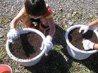 カズミちゃんは,はちの まんなかと,うえの ほうに,やさいようの ひりょうを いれました。